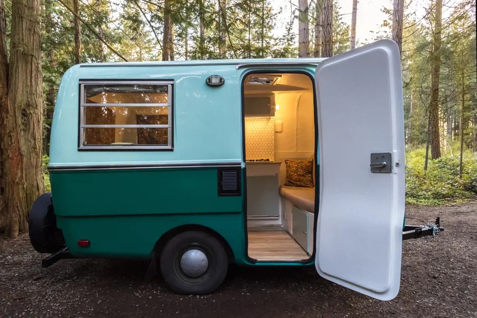 Sleeping for four can be achieved by lowering the dining table to create a double bed while the front bench converts into bunk beds which include a removable safety guard rail for the top bunk. A carbon monoxide detector, propane leak detector & fire extinguisher are included in the trailer. See the “Mycelium Ttillium Features & Inventory” picture for everything that comes with your rental!