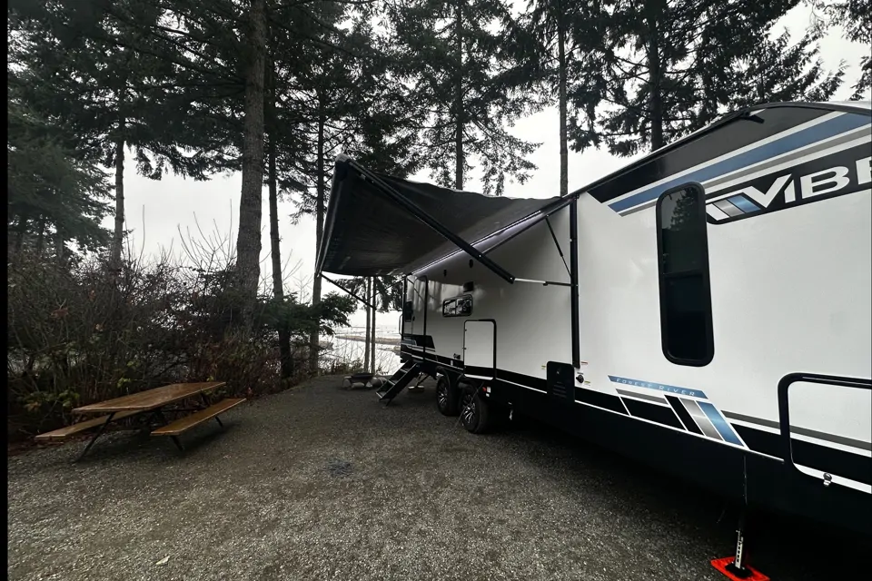 Get back to nature in style, with all the comforts of home. Be one of the first to stay in our brand new off the lot trailer, purchased new from Arbutus RV in November 2025. The ultimate in glamping, this RV is absolute luxury! Enjoy year-round camping! Spacious kitchen and galley area, with 50" tv, theatre seating, and table that converts to a very comfortable bed. Bathroom has on demand hot water, so long, hot showers for all! Porcelain toilet installed which, believe us, makes a big difference! separate bedroom has an amazing $1200 Douglas mattress. Whether enjoying the roaring furnace and fireplace, or the ice cool air conditioning, it'll be hard to get out of that bed, especially if you're watching the second smart tv in the bedroom! Three burner propane stove with oven, extra large, deep stainless sink, massive pantry with tons of counter space, sizeable double-door fridge with freezer, outdoor propane griddle, fridge, and hot/cold shower. Stunning 20ft awning with light-up outdoor speakers.