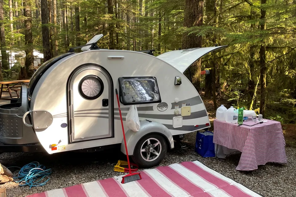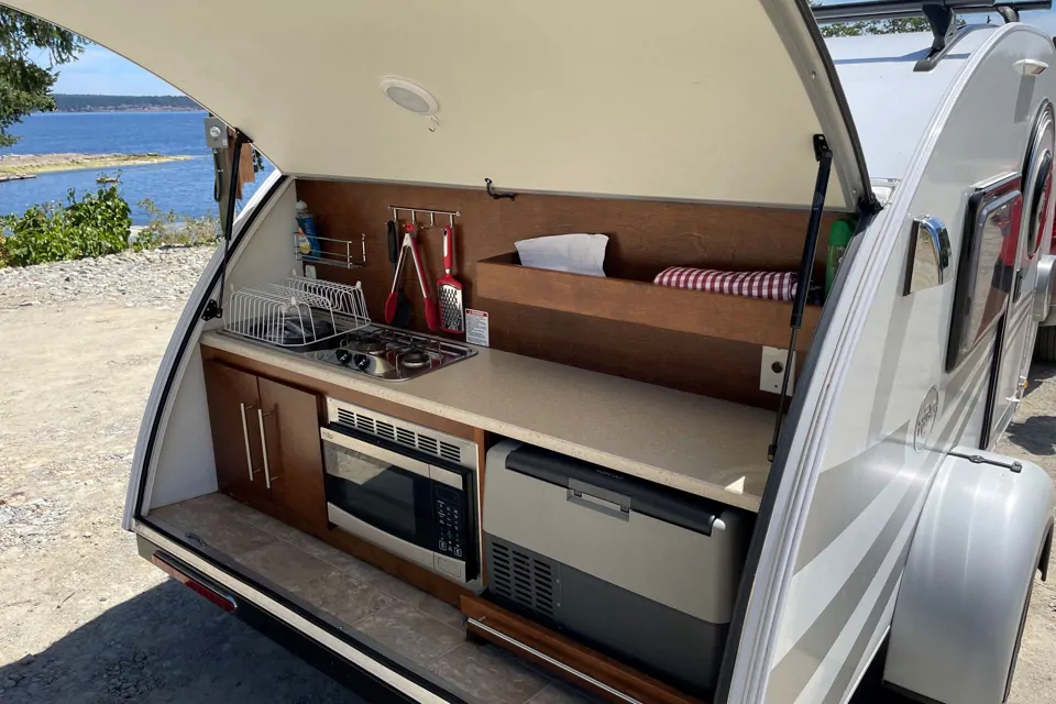 Are you looking for the perfect addition to your Vancouver Island getaway? Turn your camping trip into a "glamping" trip in our 2018 T@G teardrop trailer. This trailer comes equipped with an outdoor kitchen fit with a working sink, propane stove, microwave, and plug-in cooler. No need to pack cooking supplies, we've got you covered with cutlery, plates, cups, pots and pans for all your outdoor cooking needs.