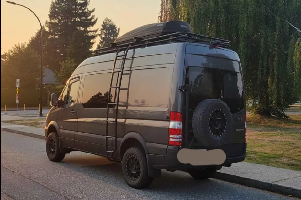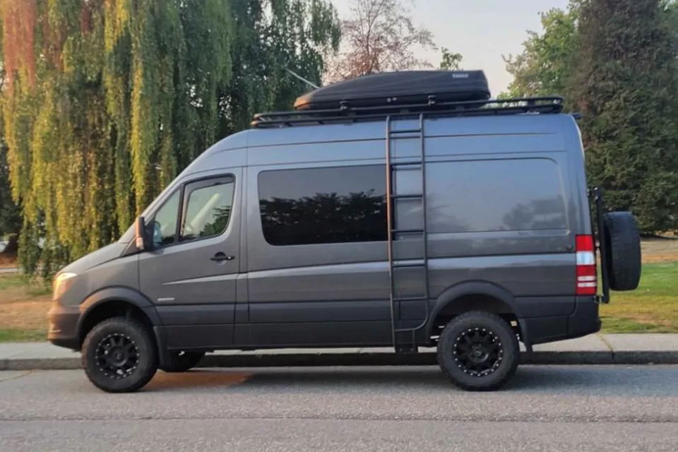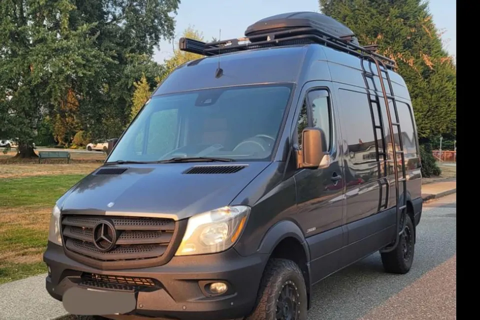 The van comes equipped with a Maxxair fan to keep air moving in the summer and an Espar Diesel heater to keep you cozy in the winter.