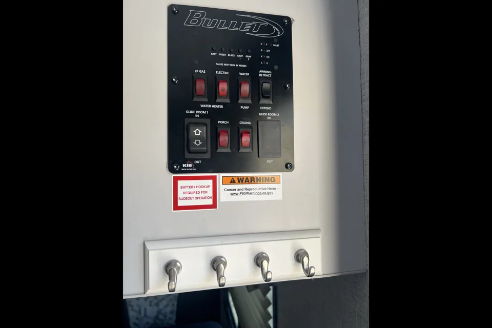 Slide-out provides ample interior space. Also equipped with a TV and DVD player as well as board games for those rainy days and outdoor games for sunny days. Kitchen is equipped with everything you need to prepare meals including coffee maker, toaster, full set of dishes, glasses and coffee mugs, air fryer and a pancake griddle. Ice maker available for an additional fee.