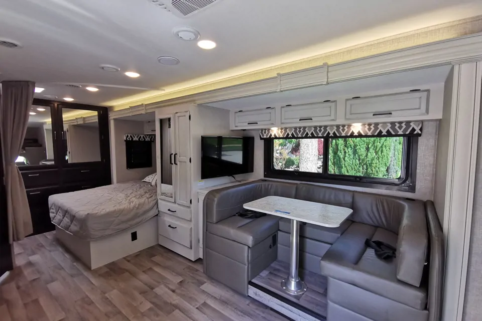 2022 Thor 24B class C four wind is built on a Ford V10 6.4 L gas engine. It is extremely easy to drive. Great choice for family of 5. With 2 shoulder belts at the front and 3 lap belts in the cabin, sleeps 4 adults or 2 adults and 3 kids. Equipped with built-in generator, propane tank. Large storage compartment. Private master bedroom with queen bed in the back of unit. The dinette folds out a bed with the couch. Over head cab is big enough to sleep 2 adults. The whole unit provides comfort and luxury traveling experience.