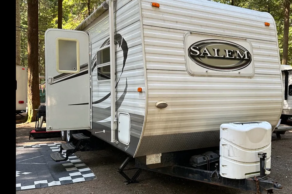 This Salem trailer is spacious with one slide out. There is plenty of space for you and your family. It has 2 single bunks, table that turns into a bed , a couch that turns into a bed and a master queen bed.
