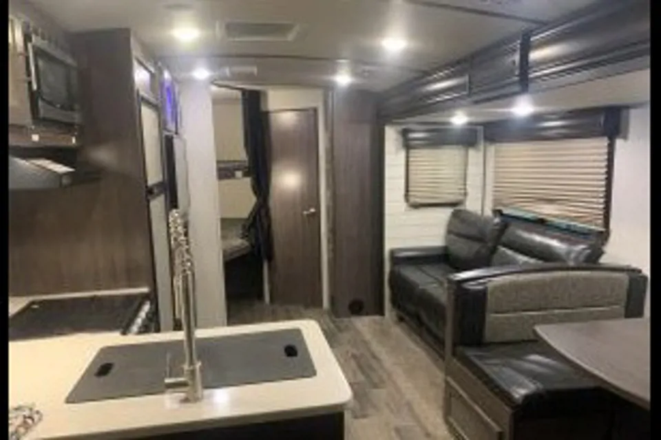 This unit comes with a fully equipped kitchen, including a gas stove, sink, refrigerator, and microwave, making meal prep easy wherever you go. The entertainment system includes a large TV, built-in stereo with a DVD player, cable access, HDMI inputs, and Smart TV connectivity—perfect for streaming from your phone. Built-in WiFi and indoor/outdoor speakers let you stay connected and enjoy music anywhere.
