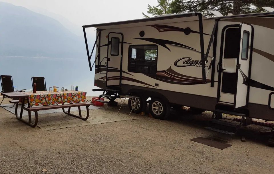 This 24' trailer has it all! Glamping is glorious! Not so big it's scary to tow, but big enough for a separate bedroom with a walk around Queen size bed and a separate bathroom with shower. We offer all the basics to make this your home away from home with cookware, linens, outdoor rugs and camp chairs. We are centrally located in the West Kootenays surrounded by great fishing rivers and lakes, mountain biking and hiking of all types - even 2 Valleys offering a number of Hot Springs! We are near the US border, about half way between Vancouver and Calgary (about 8 hours).