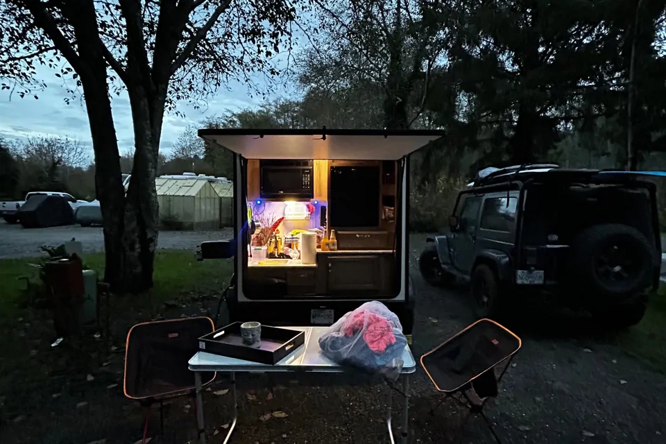 Embrace the unpredictable coastal weather with our thoughtfully appointed trailer. Curl up in comfort of the trailer and read a book, or watch a movie with our wall mounted TV. An added bonus is the A/C unit, which can help keep you refreshed during warm summer nights. However, the Glacier Package allows ample insulation to keep you warm during those colder nights, along with a small heater we provide. Rain or shine, this unit ensures a comfortable and dry haven for your camping adventure.