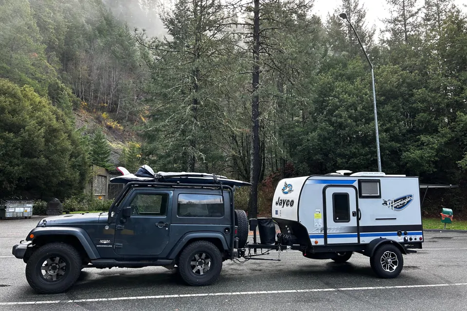 Escape to the picturesque West Coast and elevate your camping experience with our cozy Jayco micro trailer. Perfectly designed for two, it features a plush double bed, that can be converted into a lounging space, and a rear compact yet functional kitchen area. Prepare basic meals with ease using the onboard microwave, sink, coffee maker, and mini fridge. As well as ample storage to keep your dry goods organized.