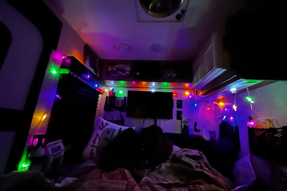 Inside includes: TV, multiple outlets, ceiling fan, lights, Bluetooth Speaker and Air Conditioner.