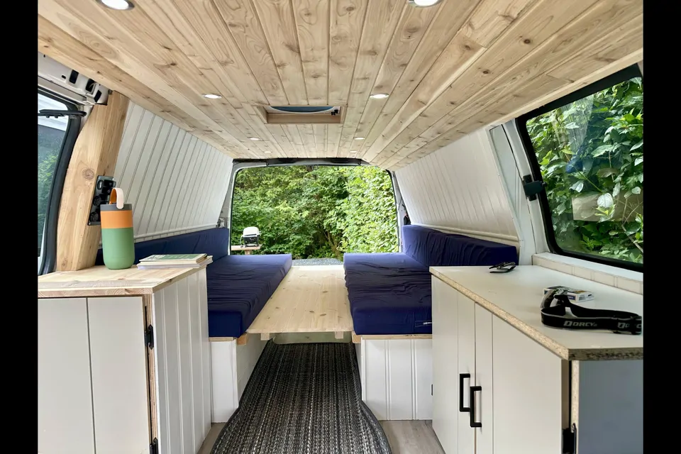 The van includes two 23L fresh water tanks, a powerful 55 PSI Seaflo pump with a 12-foot hose and shower head for easy washing, and a 36-quart fridge/freezer to keep your food fresh and chilled. Power is covered with three independent sources: a 200AH deep-cycle leisure battery, a 200W solar panel with Victron DC-DC charger, and a 12V shore power hookup — so you never have to worry about power wherever you go.