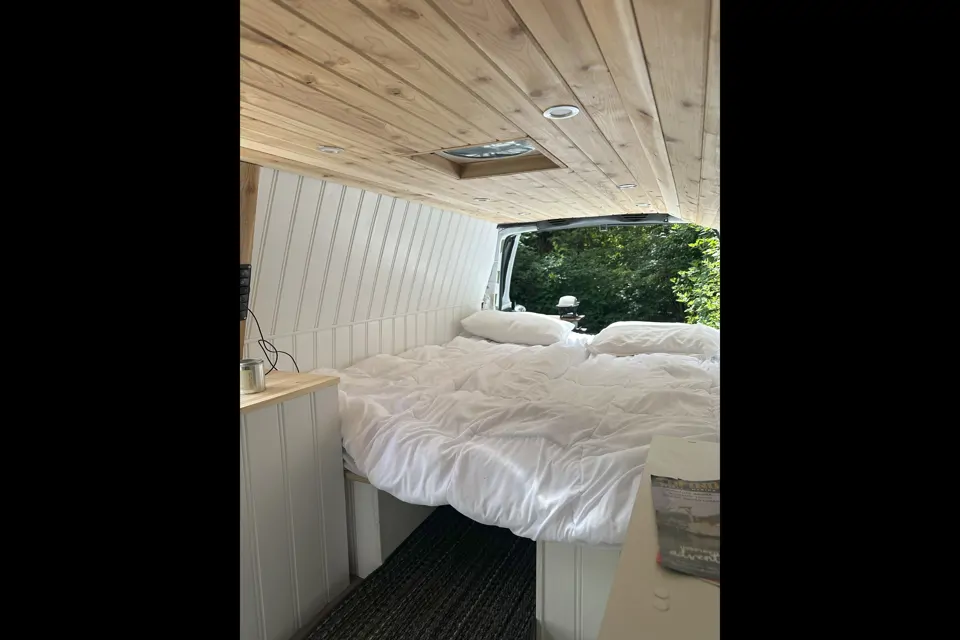 Inside, you’ll find everything you need to live and relax comfortably. The interior features a 4" firm queen-size foam mattress with washable covers, benches, and an adjustable-height table — great for eating, working, or lounging. Finished with natural pine shiplap, the space is bright, warm, and inviting. Stay cool with a 10-speed reversible roof fan, and set the mood with 12V LED lights, including a dimmable mood setting.
