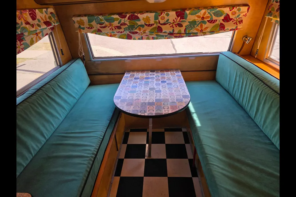 Vintage travel trailer. Re-done interiors. Sleeps two or three in king size bed/dinner. Includes all bedding and dishes. It has sink, stove, fridge and furnace. It is lifted to go into dirt roads and upgraded suspension.