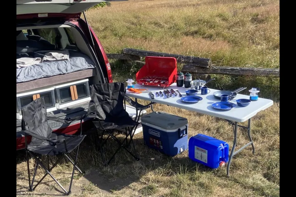 A folding 6-foot table is included for easy meal prepping as well as two camp chairs. There is a large cooler and water tank as well. Under the platform is an emergency storage bin containing