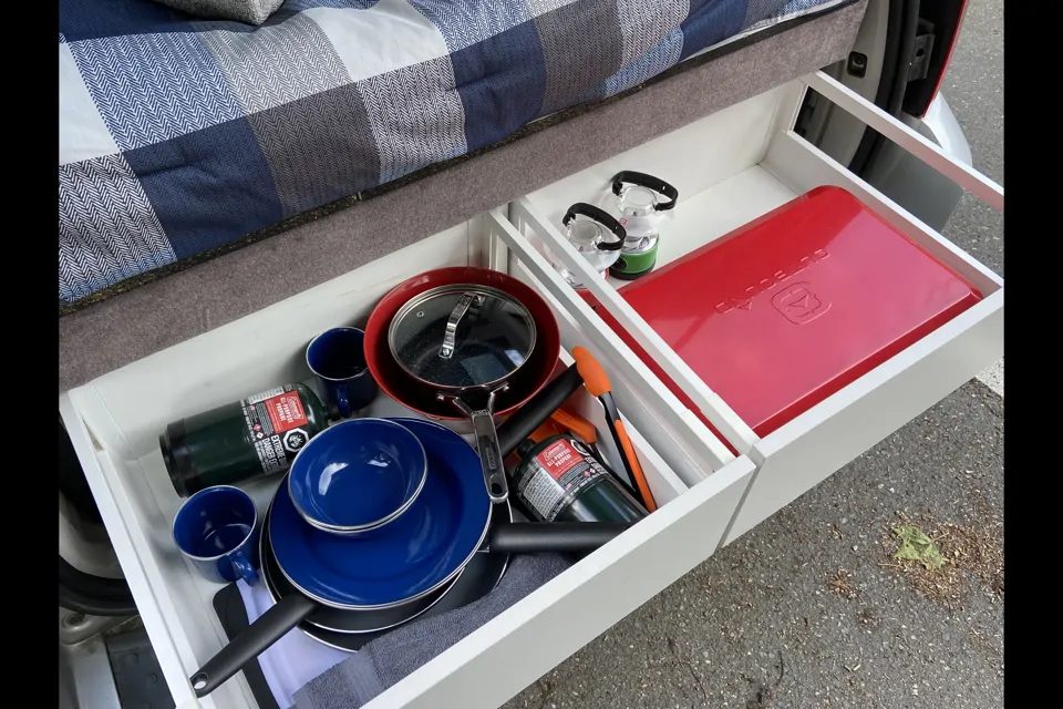 A folding 6-foot table is included for easy meal prepping as well as two camp chairs. There is a large cooler and water tank as well. Under the platform is an emergency storage bin containing
