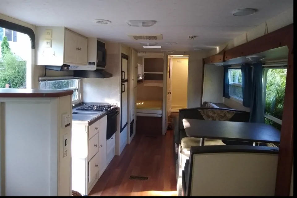 This 29ft trailer is a beautiful, spacious getaway dream. It has everything a large family or group needs to be comfortable and enjoy any adventure. It includes all of the living necessities (sheets, pillows, blankets, dishes, utensils, cookware...) All of the windows are clear glass so the interior is very bright all day long and at night, draw the 2 sets of shades and have complete darkness. One area of the trailer can be sectioned off for children so that the adults can stay up and play cards while the kids sleep in the back. Indoor and outdoor stove. Sound system, awning, AC and more. Plugs in to power source (adapters available) to run fridge, AC, microwave... 5 beds total, 3 of which are 2 sleepers.