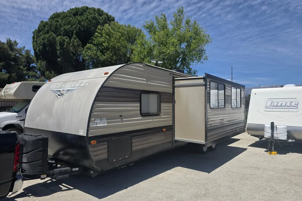 2019 forest river x-lite with a master bedroom with a queen bed and storage on both sides of the bed. Wall plugs with regular plugs and USB plugs all over. A bunk house in the back with three beds ,and a couch that folds out to a bed with storage under it and USB plugs on walls. The horse shoe dinette turns into a bed and so does the couch. There is a full bathroom inside with shower, toilet and sink and a shower outside as well. There is a full stove/oven and microwave and sink. The TV is a roku smart TV and there is a Bluetooth radio with speakers inside and out. There is also a sink and induction stove and small refrigerator outside. It will also come with a couple folding chairs and a mosquito canopy.