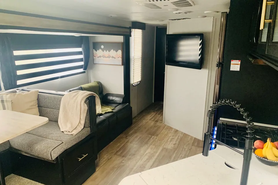 A 2021 Grey Wolf Patriot Edition travel trailer, is now ready to go on an adventure with you. We provide delivery and set up. This spacious trailer is fully stocked and will comfortably sleep 8 adults and two of your 4 legged best friends. One bedroom consists of 3 beds, a large closet and has a door for privacy for adults and kids alike. A large master bedroom has a queen size bed, 2 closets and storage, with an entry into the spacious bathroom. The large bathroom has a brand new spacious shower and toilet. The slide out in the kitchen/dining area allows for your entire party to comfortably lounge at the U-shaped table and on the cozy couch. Have your own tunes? This trailer has bluetooth with speakers inside and outside. The blue accent light gives you the option to switch up the ambiance... The kitchen offers a large pantry, brand new full size refrigerator, microwave, a farm house style sink, 3 burner stove and oven large enough to bake cookies. The party doesn't stop when you're ready to go outside. The bluetooth outdoor speakers keeps the music going and there is a full outdoor kitchen! Spending the day at the beach? Rinse yourself off with the outdoor shower. Don't worry, it has hot water. No fiddling around with the awning; With a push of a button you can easily put it out or in. Once the sun goes down, the outside blue light will brighten things up. The solar panels will insure that the lights will not go out... Happy camping!