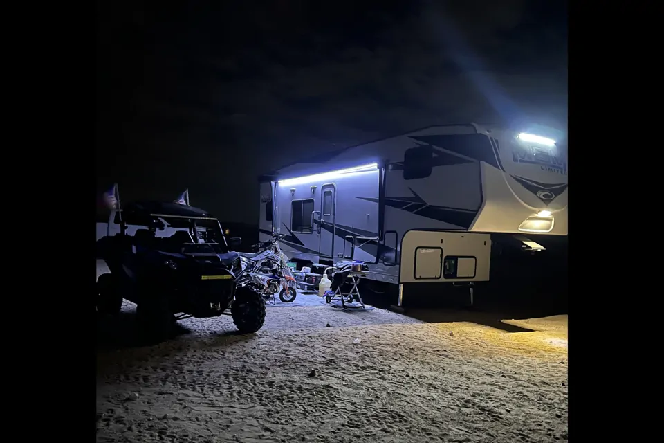 Outdoor Awning & LED Lighting – Relax in the shade after a day on the trails