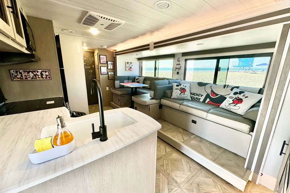 Beautiful Disney themed, state of the art 2024 glamping travel trailer. We have everything you may need while you create new memories with your family. Enjoy a shower outside with hot water, two propane tanks, solar powered and ready for your next trip. 3 indoor TV’s, Nintendo Switch, outdoor screen with projector for night time use, WiFi. Fire TV’s are programmed with Netflix, Disney+, Prime, HBO, Starz and Hulu. Indoor and outdoor speakers are Bluetooth enabled. Kitchen has airfryer, blender, coffee maker, toaster, mixing bowls, pots/pans, cutting boards, etc. 8 outdoor chairs are provided, outdoor mat, and corn hole game, plus various board games. This is glamping at its finest.
