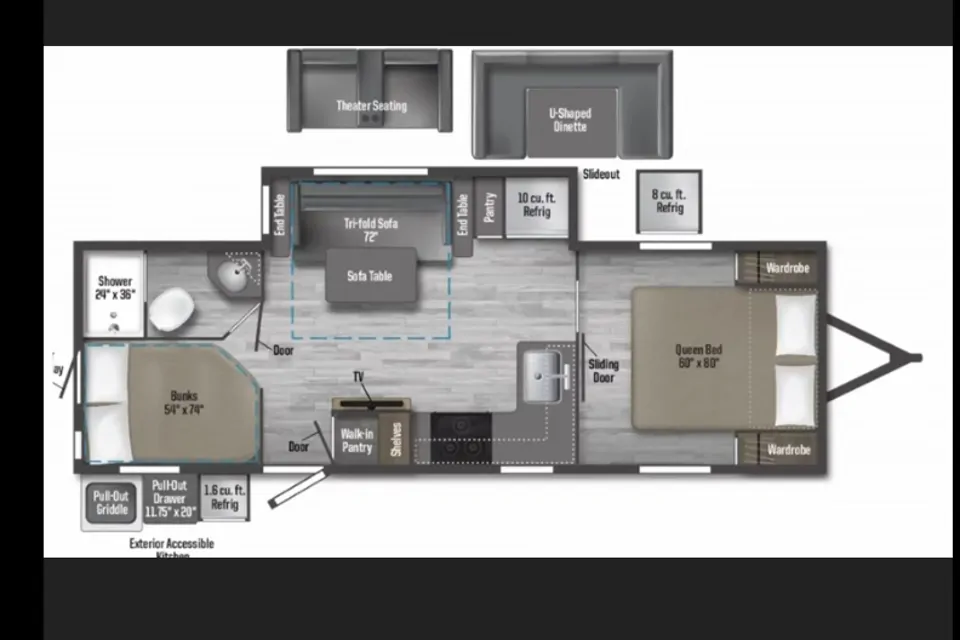 The "Star Lord" 2024 Minnie Winnebago is a peaceful retreat with all the amenities that will make your next adventure out of this world. This brand-new trailer sleeps up to 8 people and features a private master bedroom with queen bed, spacious full-size bunks and a comfy pull-out sofa. The kitchen is well stocked to include eating and cooking utensils, cookware, coffee maker, microwave/convection oven, full size refrigerator and a large pantry for all your food and snacks. Guests will also enjoy the convenience of an exterior power awning, outdoor lights, speakers and an outdoor kitchen which includes refrigerator and cooktop. Be prepared to make a galaxy of memories to last a lifetime in the "Star-Lord".
