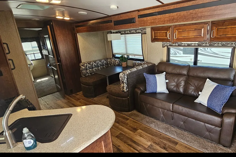 Convertible Sleeping Areas: The living area has a slide-out booth dinette and sofa sleeper, both convertible to additional beds, accommodating extra family members or guests.