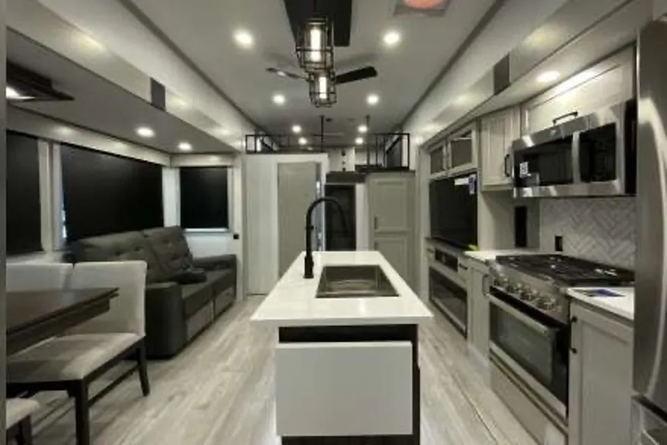 This trailer comes fully loaded with a King size bed, one queen size bed, 2 bathrooms, under-bed storage, closet storage, and plenty of drawers to store your items. In the living area you have a 50in smart tv, reclining seats, fire place, integrated vacuum system, and more!
