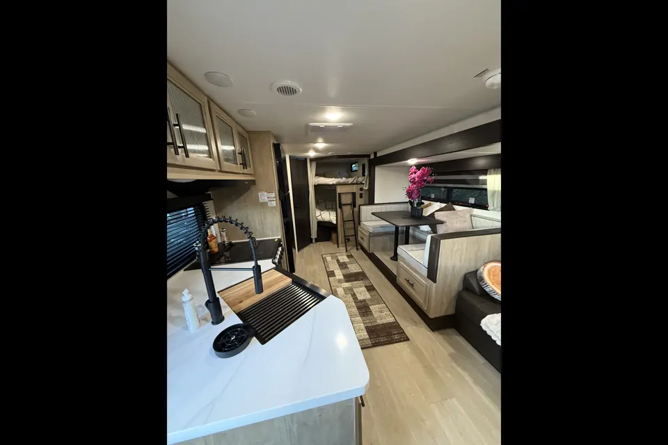 The 26DBHBL is the ultimate family camper, with a double entry and access to the bath from outside. The double bed bunk, with ladder, provides extra sleeping room for kids and adults. The modern custom kitchen, oversized full pantry and extra-large U-shaped dinette with full length drawers give you more than enough storage for camping gear and supplies. The exterior will provide a great entertaining space with the exclusive Cherokee camp kitchen, exterior speakers and TV bracket as well.