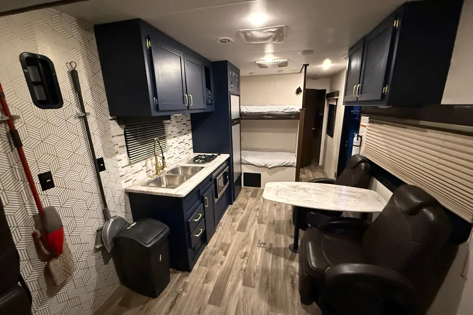This rig is awesome! It has the capability of sleeping 8 people and towing your toys. Bedroom sleeps 2 people on a queen mattress. Main room has two sets of bunk beds. One set is two twin beds and the other set is two queen/king bed. Has full kitchen with sink, stove, microwave/oven & Refrigerator/Freezer. Full Bathroom with a shut off shower head to help conserve water. Both gas and electric water heater. Will fit a full size 4 seater UTV with 15ft garage and up to 64” wide. Enjoy the trails, desert or rv campgrounds on this rig. With 2 showers and one being an outdoor shower, you don’t have to worry about getting muddy. Just clean off outside. The unit also comes with a Gas station where you can fill up your gas and pump straight from the RV to your toys. Up to 30 gallons of gas. (Gas not included and must pump 91 octane in tank) You and the family will have fun on this 30ft RV.