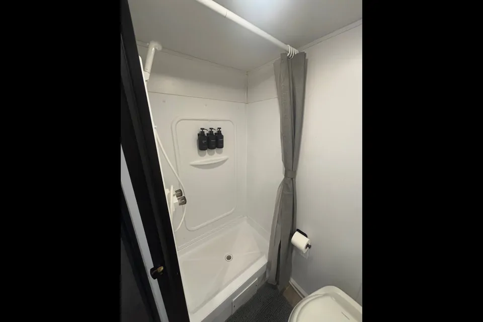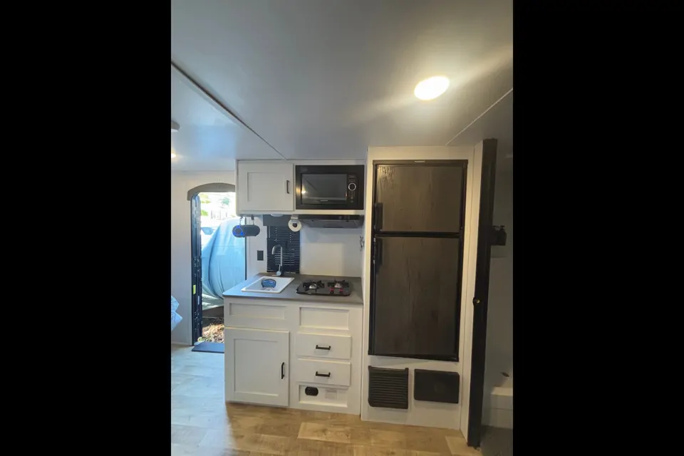Sleeps up to 4 with a queen bed and dinette bed, plus a full bathroom and fully equipped kitchen for stress-free meals. A/C, propane heat, and tankless hot water keep you cozy, while the power awning and ample storage let you relax inside or outside. The trailer is equipped with solar, so the batteries last quite a while without needing to be charged. It also comes with a full tank of fresh water.