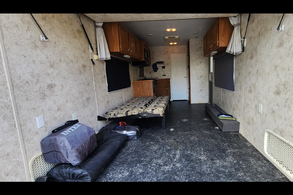 This is our 2005 Eclipse attitude toy hauler. The garage space is great, 11ft deep to the first cabinet, 73" wide and can fit a can-am RS 2 seater with room for a kids quad in the kitchen area.