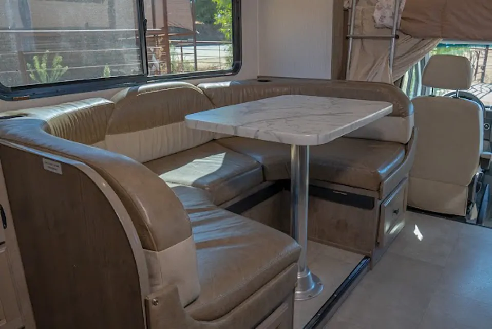 As you enter "Luna's" door, you are greeted by a large u-shaped dinette, equipped with two seatbelts which also converts to a full sized bed. Above the dinette you will find several storage cabinets fully stocked with plates, cups, mugs, disposable serve ware, napkins, paper towels, etc. Across from that is the fully equipped kitchen. You will find a double sink, 3 burner stove and oven, microwave, full sized fridge and freezer, extendable countertop, toaster, French press, waffle iron, instant pot, and more.