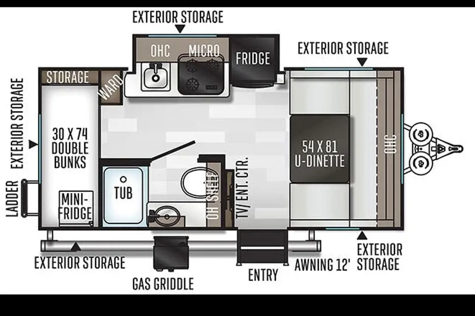 For the camping enthusiast that enjoys inside comforts but also loves to explore the great outdoors, take a look at this Rockwood Geo Pro travel trailer! You have the choice of sleeping on one of the bunk beds or the U-shaped dinette when it's folded down for the night. You can cook all of your meals inside with the microwave and recessed cooktop with flush-mount cover, or you can head outside to the outdoor kitchen to whip up a meal. The full bathroom allows you to wash up after a fun day outdoors without having to use the campsite's facilities, and you will find plenty of space to store all of your camping gear with interior overhead cabinets, as well as the exterior storage compartments.