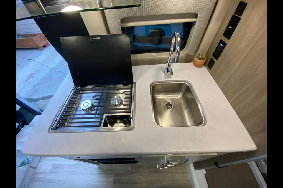 3. Fully Equipped Kitchen: Prepare your favorite meals on the go in the well-appointed kitchen, complete with a refrigerator, microwave, sink, two-burner stove, and ample counter space.