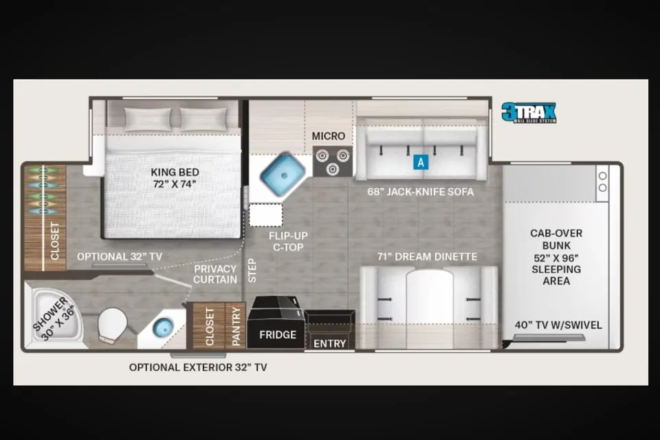 At just under 30 feet, this coach can fit in most campgrounds but still gives you the space you want on the inside. It’s an ideal choice for first-time RVers, small families, or couples who want to hit the road in style without the learning curve of a larger rig.