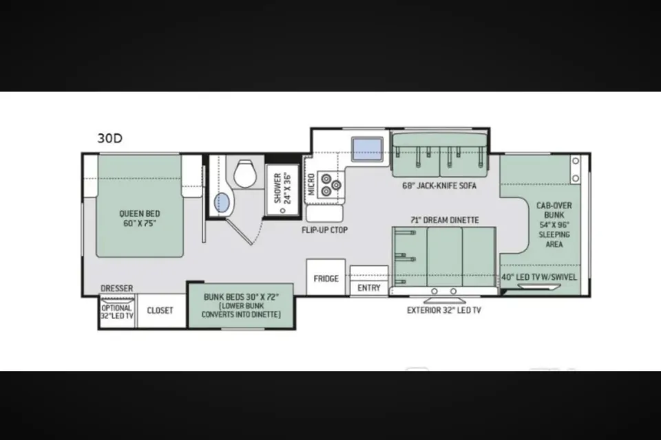 Despite its generous interior space and sleeping capacity, the 30D is still easy to drive and fits into most RV-friendly campgrounds. Whether you’re headed on a weekend escape or a multi-state adventure, this RV is ready to go the distance.