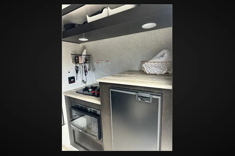 You can be free to explore with the comforts you've grown to love in this Free Solo Plus teardrop trailer! After you exert all of your energy exploring the campsite, you'll want to have a hearty meal to replenish that energy, and the two-burner cooktop and three-way refrigerator are going to be the most help to get that task done. You won't even have to try to start a fire in order to get dinner ready. The other feature that is going to be extremely useful is the wet bath. Now you can get cleaned up after that last hike. You can also use the Bluetooth stereo with speakers to play some fun and upbeat music as you finish out the day.