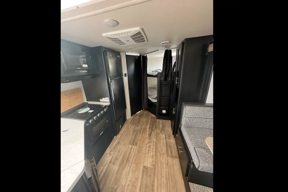 Designed with comfort and space in mind, this RV sleeps 6–7 guests with a cozy queen bed up front, bunk beds in the rear, and a dinette that easily converts into an extra bed—perfect for families or group getaways.
