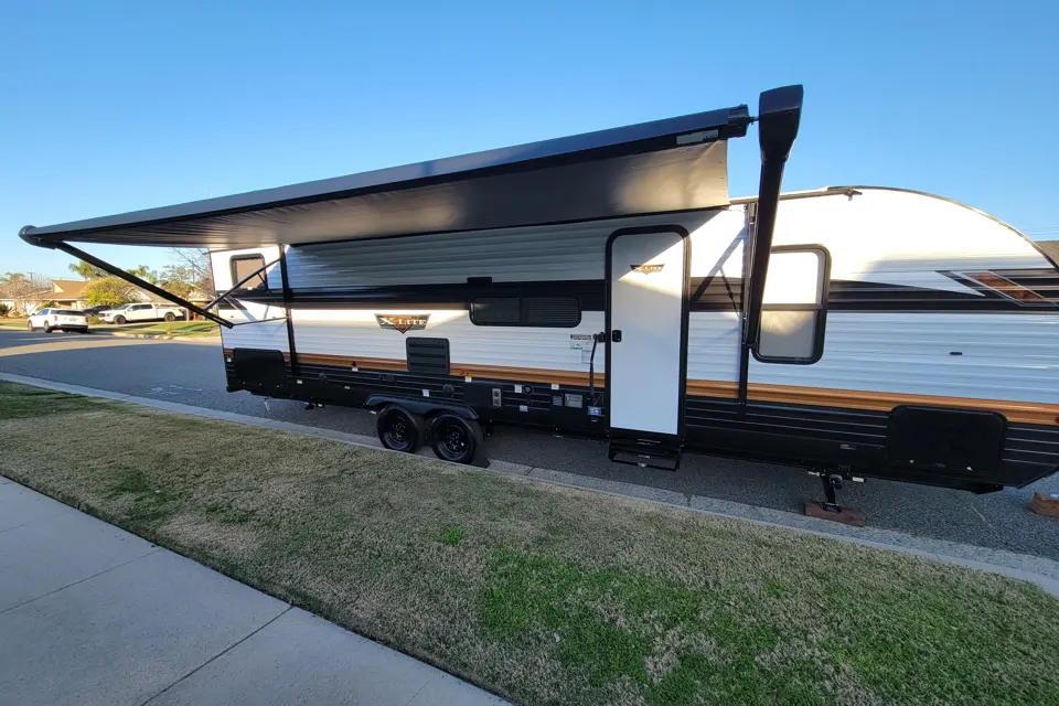 Forest River XLite with private Bunk room. It is fully equipped with all things necessary for you to enjoy camping with your family. It features a powered awning with led lights to brighten your nights and keep you protected from the elements, easy to use electric stabilizing jacks, 3 burner stove top, microwave, a couch that pulls out into a bed as well as a dinette that converts into a bed, and a rear bunk room that has 3 twins and a couch.