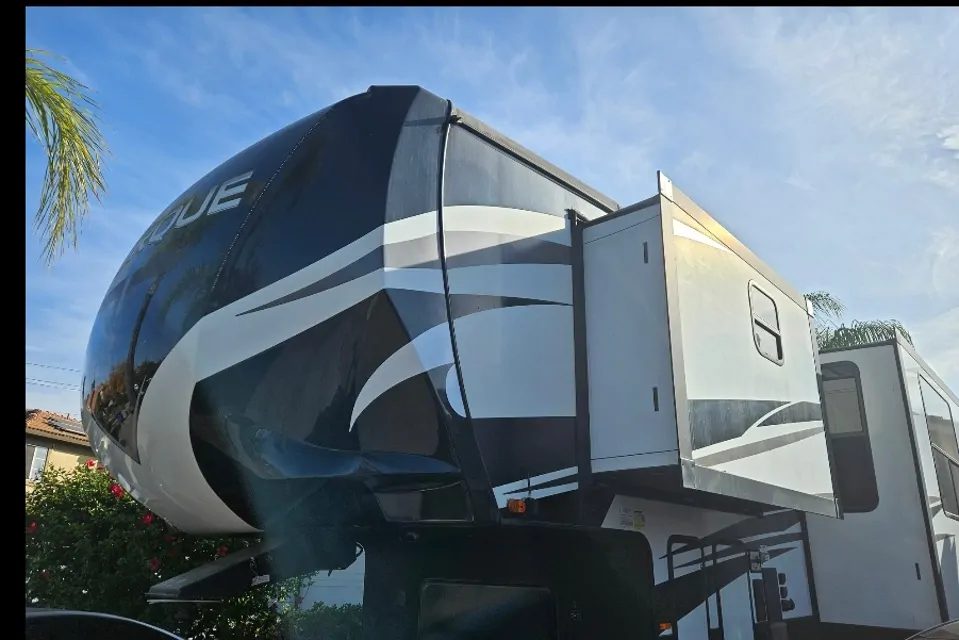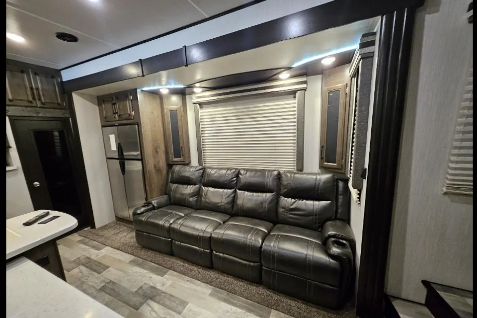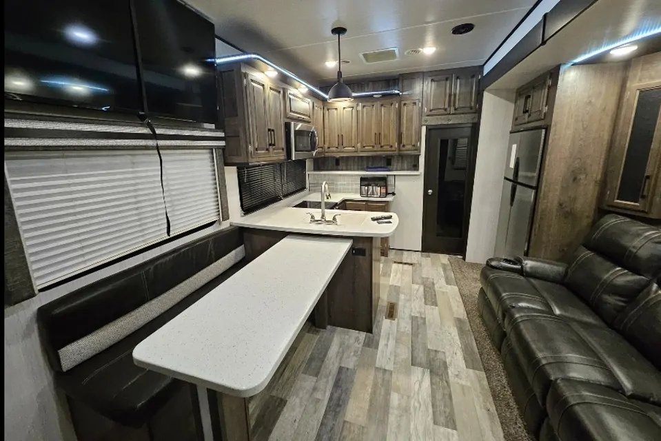 Enjoy a comfortable getaway in our beautiful 2 bedroom, 1.5 bath, 5th wheel RV. There's a King size bed in the master bedroom, a bath tub/shower, nice TV's throughout as well as a fire place in each room. It also has central heating and air conditioning. It has a outdoor kitchen with a TV and refridgerator with a beautiful awning, an outdoor patio with an awning in the rear of the unit as well as an outdoor shower. Look no further, book today!