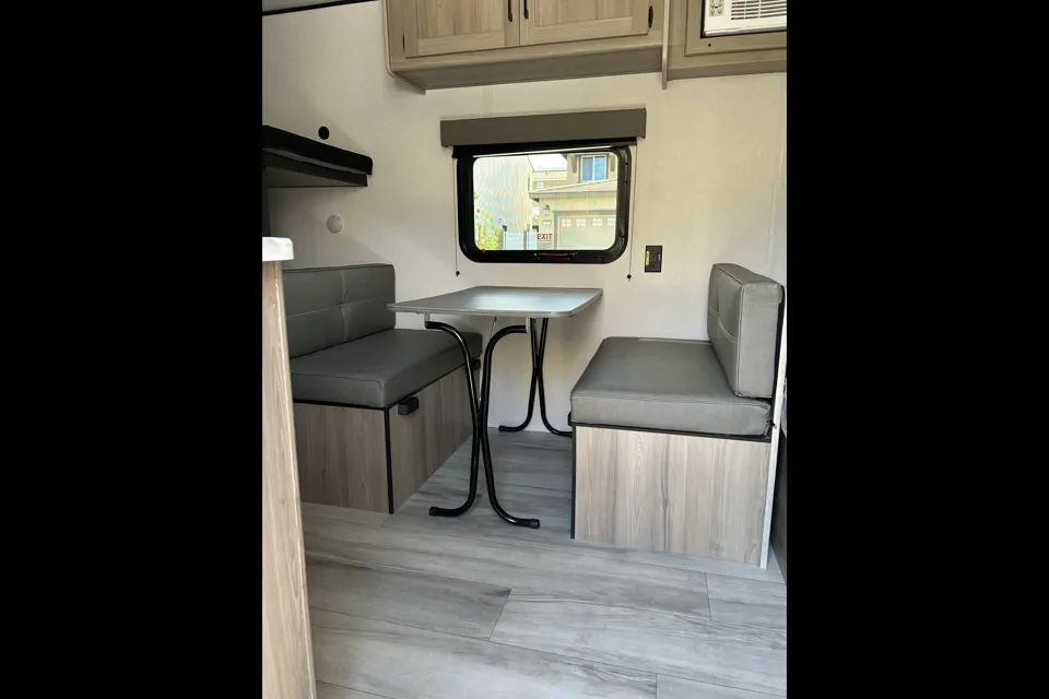 Sleeps up to 5 comfortably with a queen master bed, double bunk beds, and a convertible dinette—ideal for families or small groups. Light, breezy, and functional.