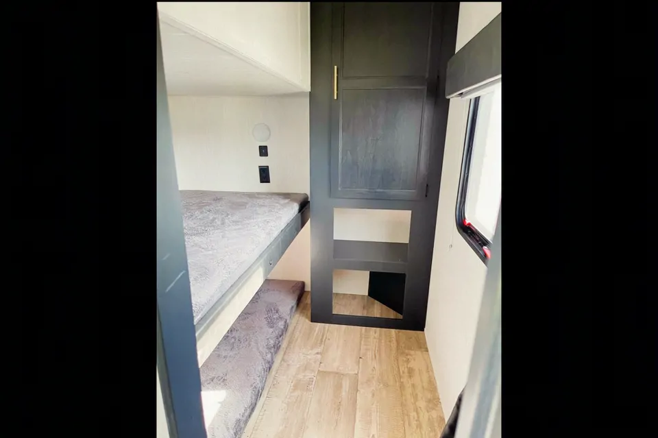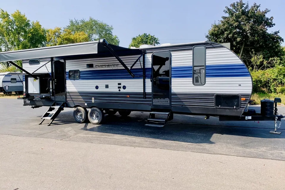 The Cherokee 29GEBG is a great family travel trailer. Large living area and bathroom. The master bedroom has a queen bed with a private door to the bathroom. This trailer features 2 separate bunk room. Bunk room 1 is a double bed loft with a ladder for easy access. Bunk room 2 has 2 single bunks with a wardrobe for your clothes, shoes, or storage. Power outlets and USB plugs throughout trailer. Both the large u-shaped dinette and love seat convert to beds for extra sleeping space. Large refrigerator in kitchen for lots of cooling space. For you coffee drinkers, bring your favorite KCup pod or ground coffee and use the reusable pod with the included Kuerig coffee maker.The exterior of the trailer sports a large outdoor kitchen with a sink, storage cabinet, out door grill, ice maker, and double door refrigerator. Starlink Internet, generator, portable pellet grill available at additional fee