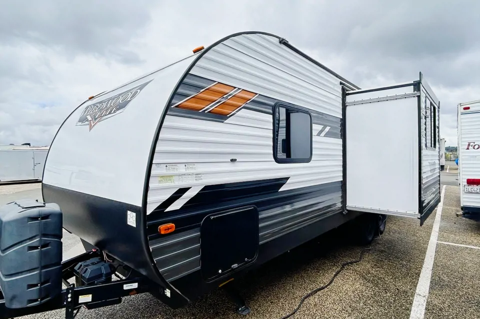 Our new and beautifully decorated trailer is perfect for any family looking for a comfortable adventure. 2021 Forest River Wildwood X-Lite T241BHXL is 28ft long and has a queen size master bedroom, 2 oversized full bunk beds, and a convertible dinette, 10 cu. ft. refrigerator, electric fireplace, and outdoor kitchen.