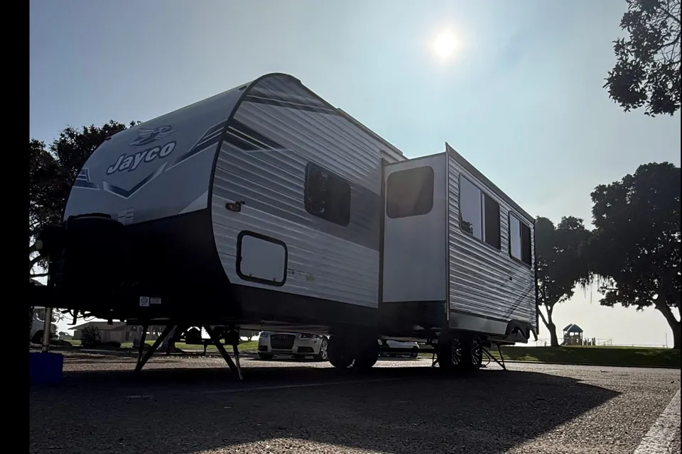 Hi everyone, welcome to our 2025 Jayco jay flight 286bhsw. It is a fully equipped trailer with a queen bed and two full bunk beds. Table turns into another bed & both seats recline all the way back. Comes with 2 smart tv’s. ( tv in the back has a quick release and can be be hung outside with a push of a button. Bluetooth speakers inside and out. There is also a small pull out black stone griddle outside with mini fridge and shelf. Solar panel so your fridge will already be cold upon delivery. Fully stocked bathroom with towels & toiletries. We provide utensils for eating and cooking along with napkins. All the hoses (water,sewer, power cords and surge protectors. Charging stations and lights all threw out trailer. LED lights outside under canopy & inside the mini fridge section. New clean blankets and king pillows threw out. So much more. This is a perfect trailer for family and friends whether you’re going to the bay/ beach, going camping or just need extra room for family and friends coming from out of town. This is the trailer for you. It does have solar panels which to provide power for everything from trailer except for TV and AC. With that in mind, we do rent a quiet generator big enough to power the whole thing for when you’re Boondocking he’s so free to reach out to me with any other questions or how we made better serve your needs.