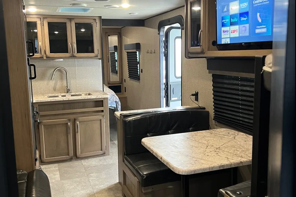 Hello there people!!! Do you want to go camping but hate staying in a tent!? Look no further! We got you covered with this beautiful 30 foot Trailer! Private master bed room and bunk beds. Trailer will be all set up and ready for you when you arrive! Book now and reserve your next vacation!