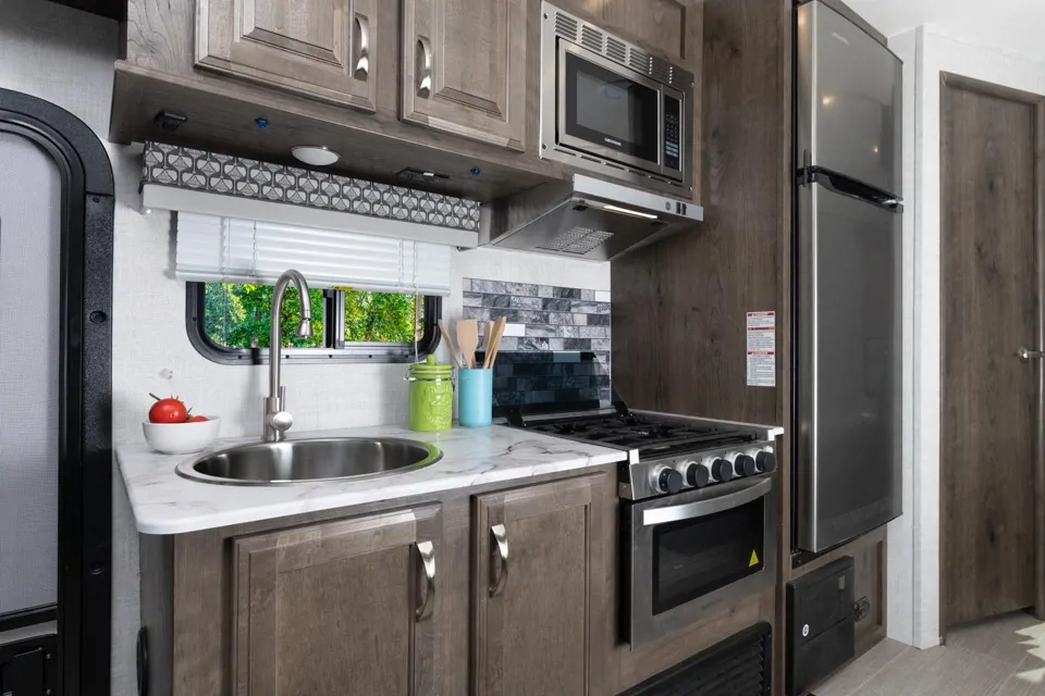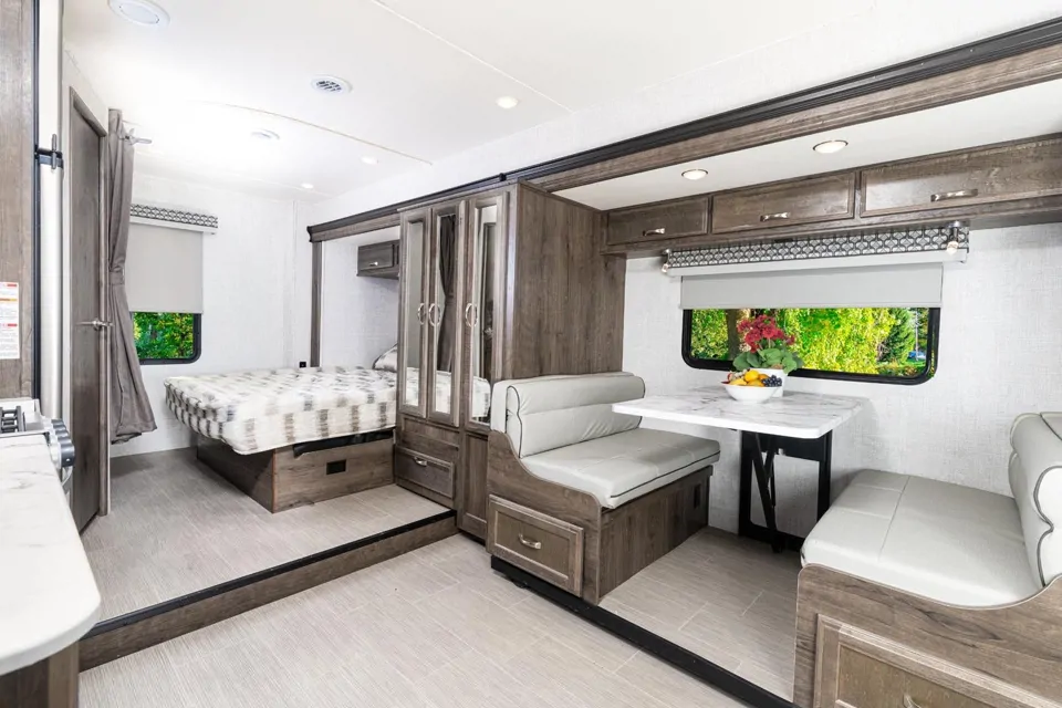 There are three beds available, including a queen bed in the master, an oversized queen bed over the cab, and a dinette that folds out to a full bed. Both the master and overhead beds have privacy curtains.