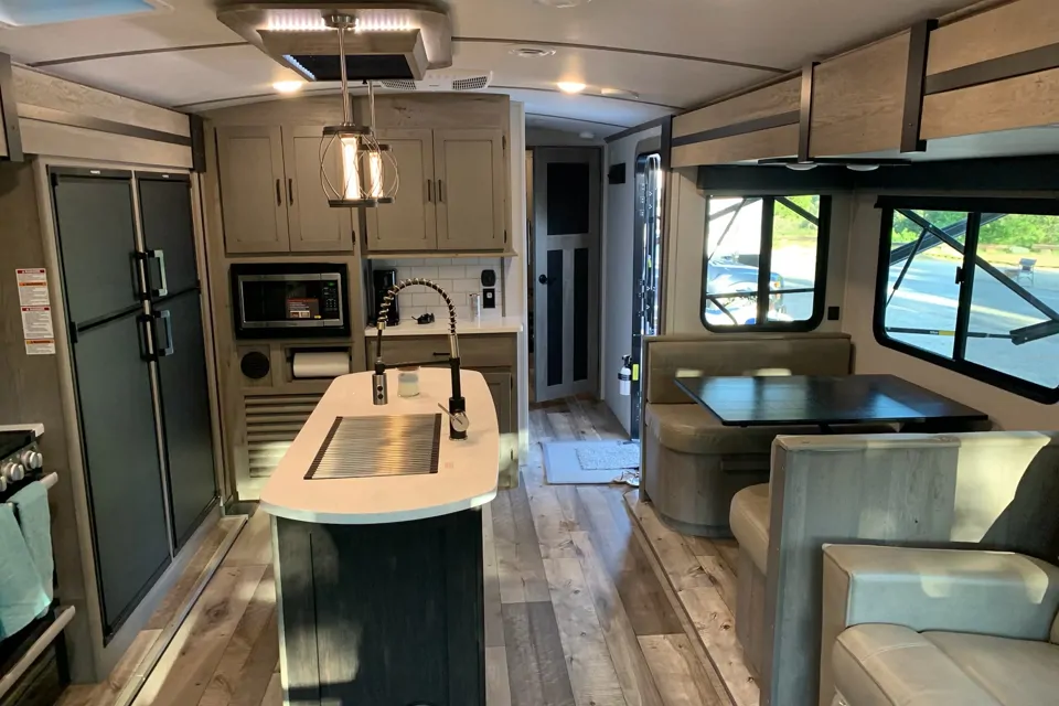 This Outback 328RL is a luxury travel trailer known for its spacious interior and comfortable amenities, making it suitable for couples or families. It features a rear living area, three slides for maximum space, and a king-size bed. Key features include a fireplace, theater seating, and a large entertainment center.