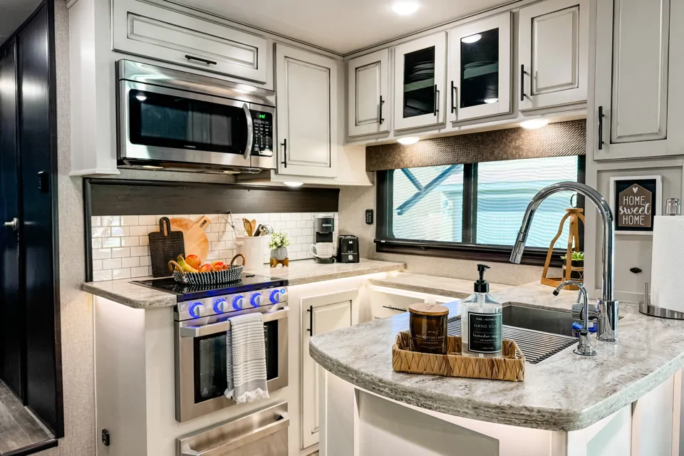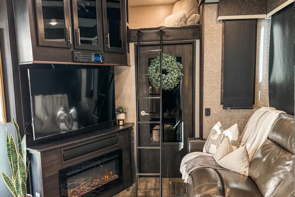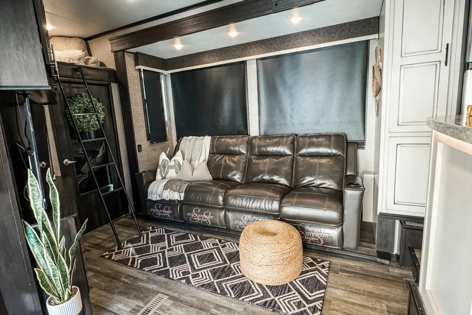 This Seismic trailer is the ultimate camping/RV experience. At over 45 feet this trailer has it all. Large dual door refrigerator, upgraded shower and shower head, two bathrooms, (4) flat screen TV's, extra large reclining and massaging sofa and (2) patios. The master bedroom has an upgraded King bed, its own AC unit and additional flat screen TV.