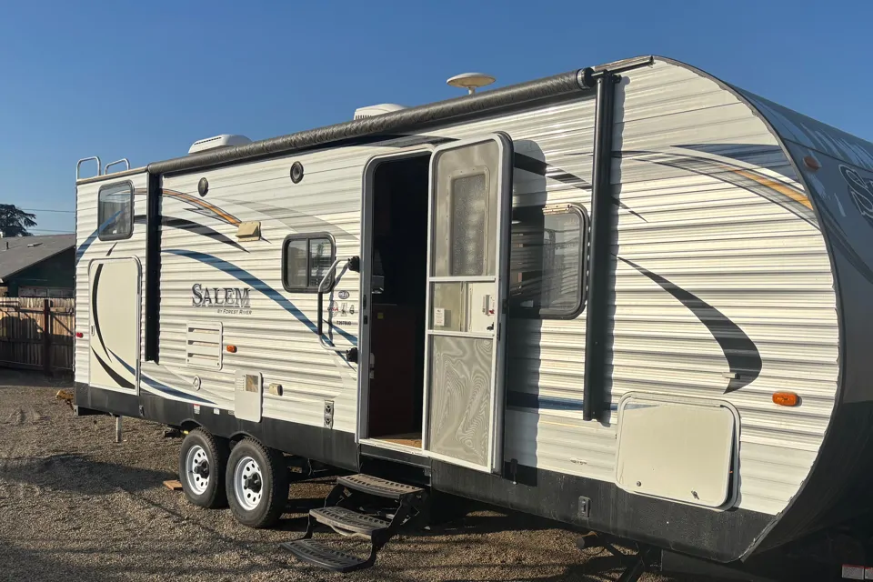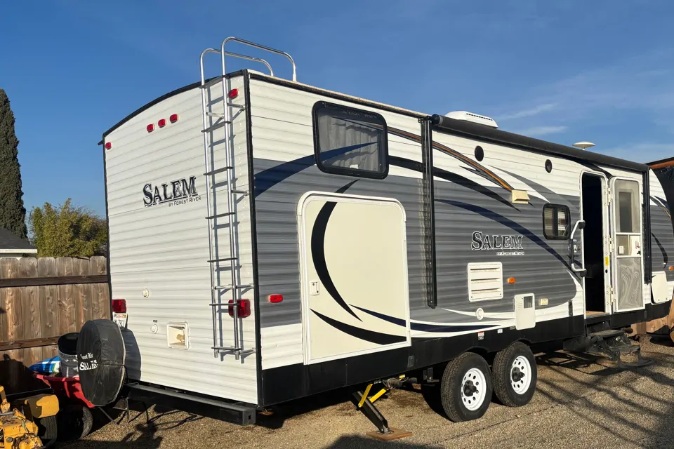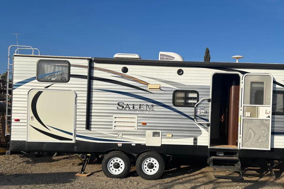 This 2015 Forest River Salem is great for the whole family or friends getaway. With sleeping capability of up to 7 people, the family can experience the great outdoors. It weighs about 5790 dry weight, it can be towed with a half ton truck (1500). The trailer has a queen bed room with sliding doors, a dinette that folds into a bed, a couch that can turn into a bed, a kitchen, a restroom, a shower, a fridge, a freezer, an awning, Bluetooth radio, and triple twin bunk beds. You and your family/friends will definitely enjoy the outdoors!