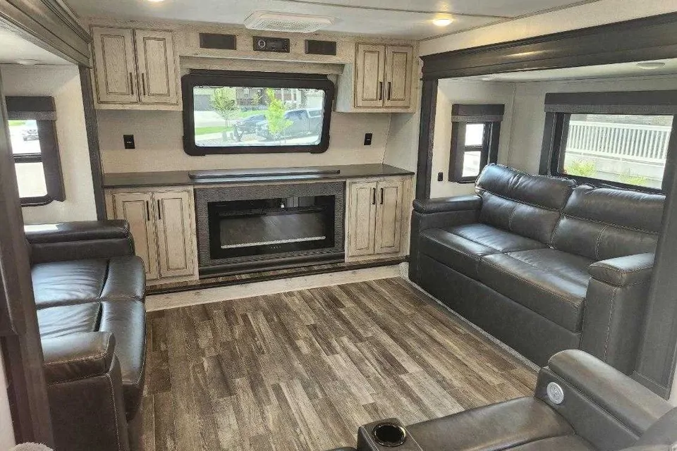 This Keystone Avalanche will allow you to enjoy outdoor camping with the comfort and dependability of a home. Front living with plenty of seating, two pull out sofa's, massage recliners and a huge TV for those rainy nights. Dining table that seats 4, full size fridge, and plenty of pantry and counter space. King sized camper bed and double sliding door closet in the master bedroom. 10' sliding storage out of the back is perfect for paddleboards, bicycles, or small kayaks.