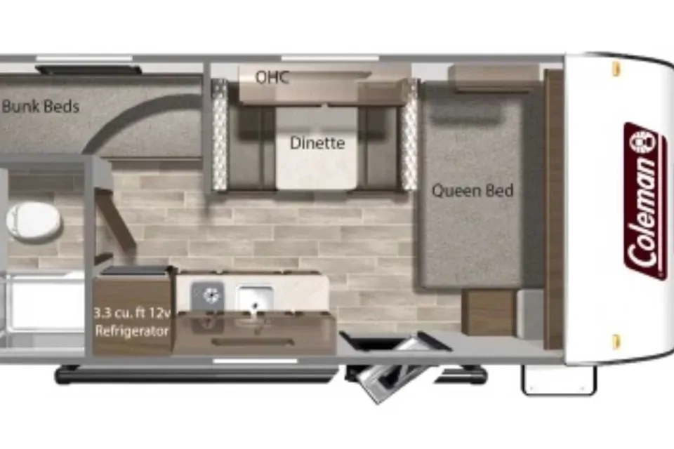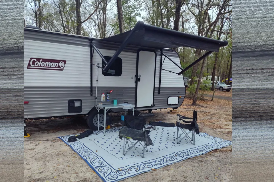 17ft 2023 Coleman lantern camper perfect for small group with one queen size bed and two single bunk beds. Everything is included with the camper for inside and outside needs. All bedding and kitchen necessities as well as outdoor rug, table, and chairs.