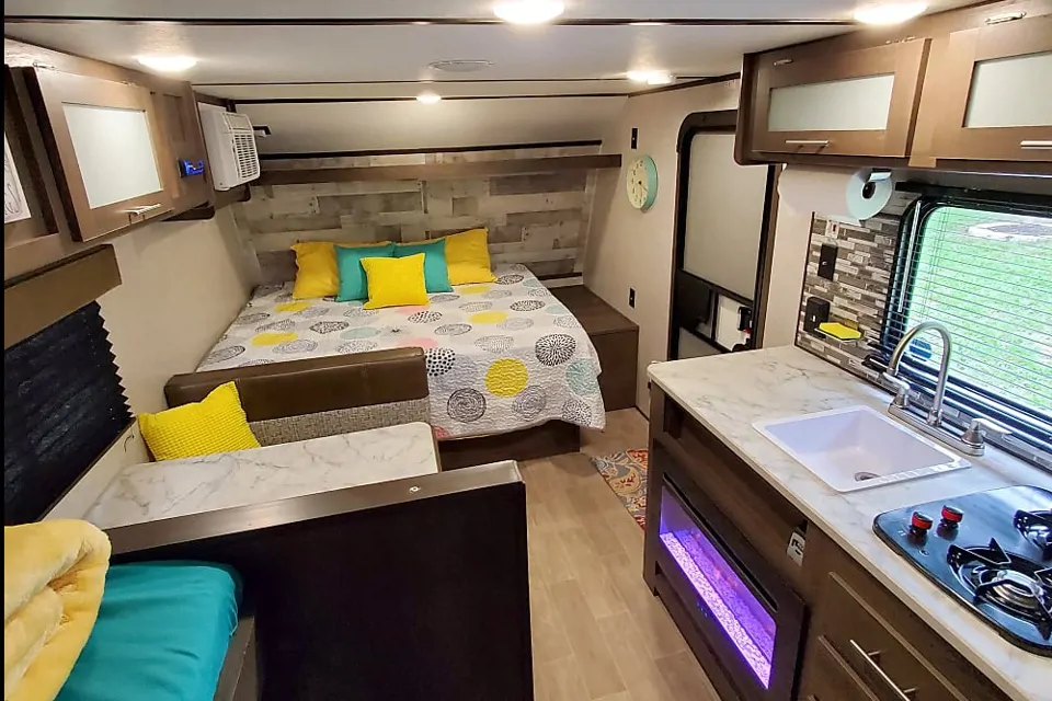 "The Little Mrs." She is our super cozy lightweight travel trailer. Equipped with a queen bed with memory foam topper and 2 single bunks (bottom bunk is also topped with luscious memory foam to accentuate your comfort). The dinette table converts to a bed if needed for a 5th person.